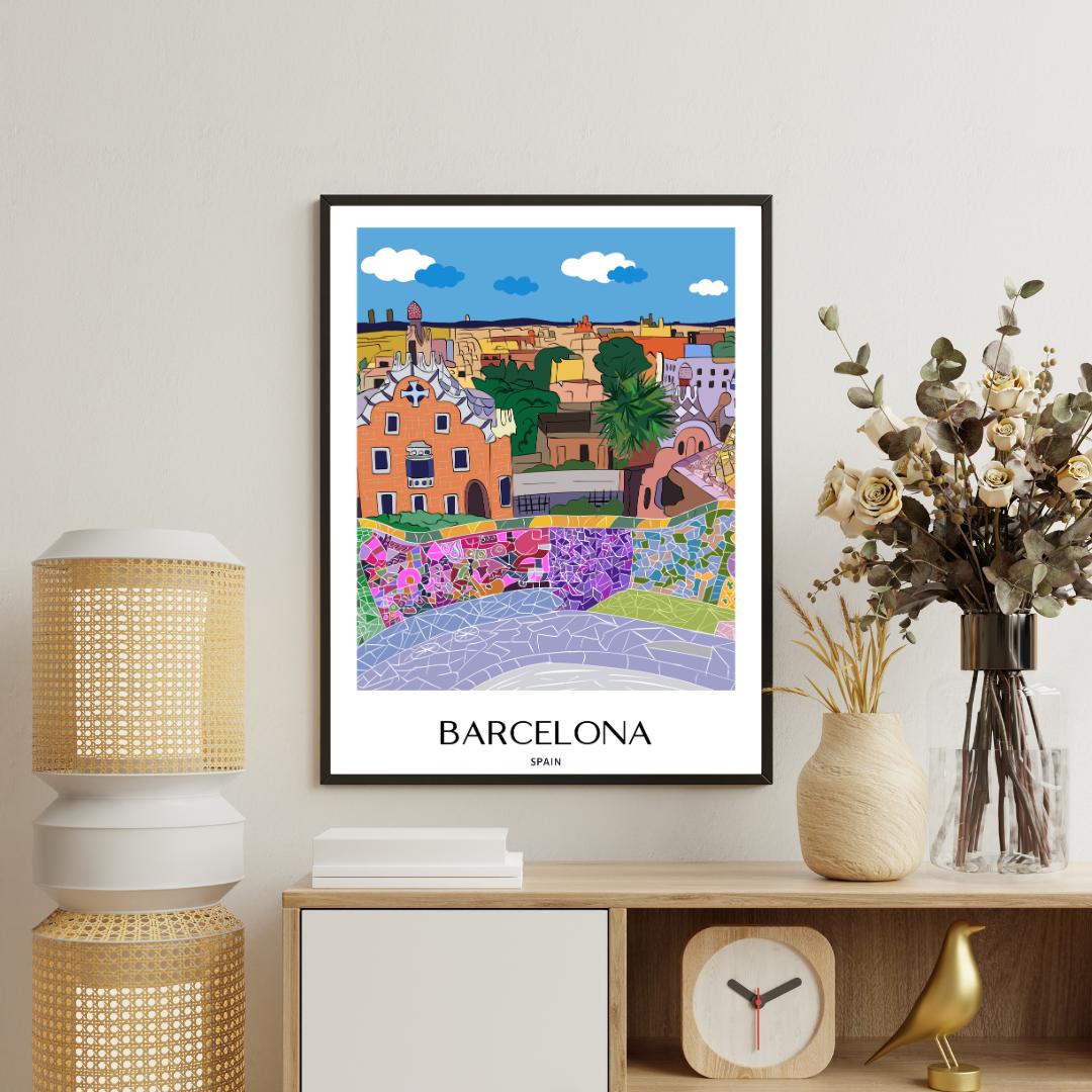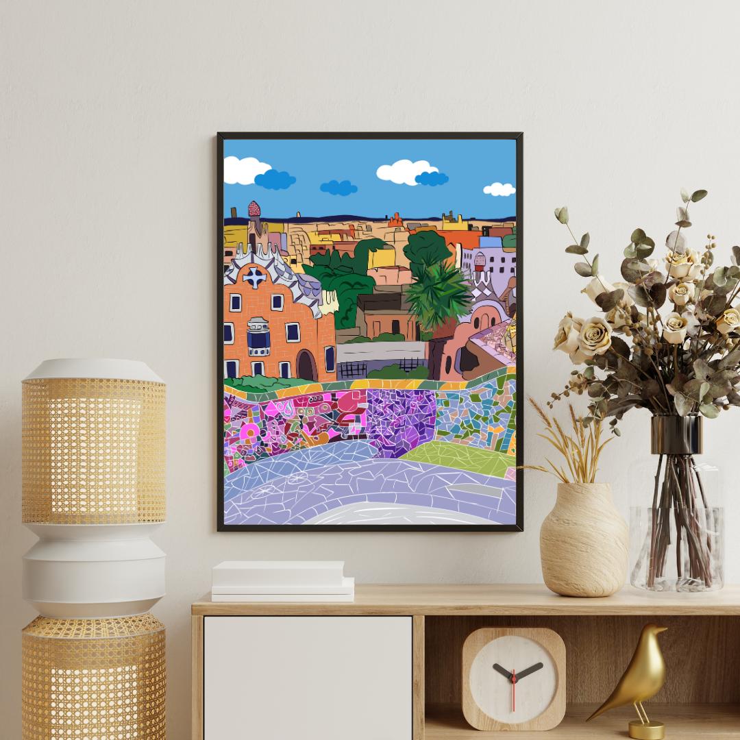 Bring the vibrant energy of Barcelona into your home with this hand-drawn Park Güell illustration inspired by Antoni Gaudí’s iconic architecture. This colorful digital artwork captures the whimsical forms, mosaic details, and artistic spirit of one of Spain’s most famous landmarks.