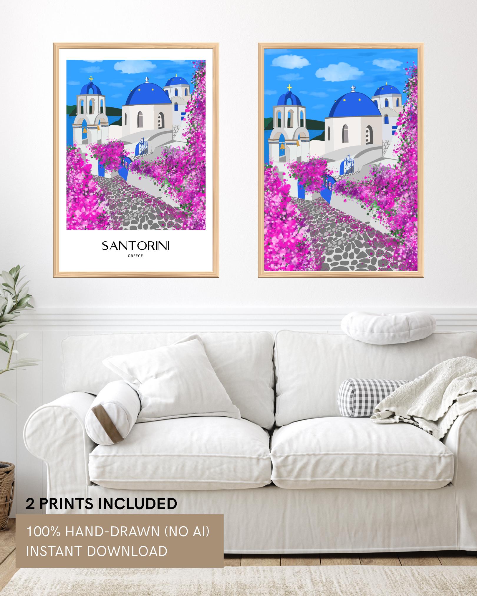 Bring the dreamy romance of Santorini into your home with this hand-drawn illustration inspired by Oia’s iconic blue domes and cascading pink bougainvillea. This Greek island travel poster captures the timeless beauty of whitewashed architecture, bright blue skies, and the magical atmosphere of the Aegean Sea.