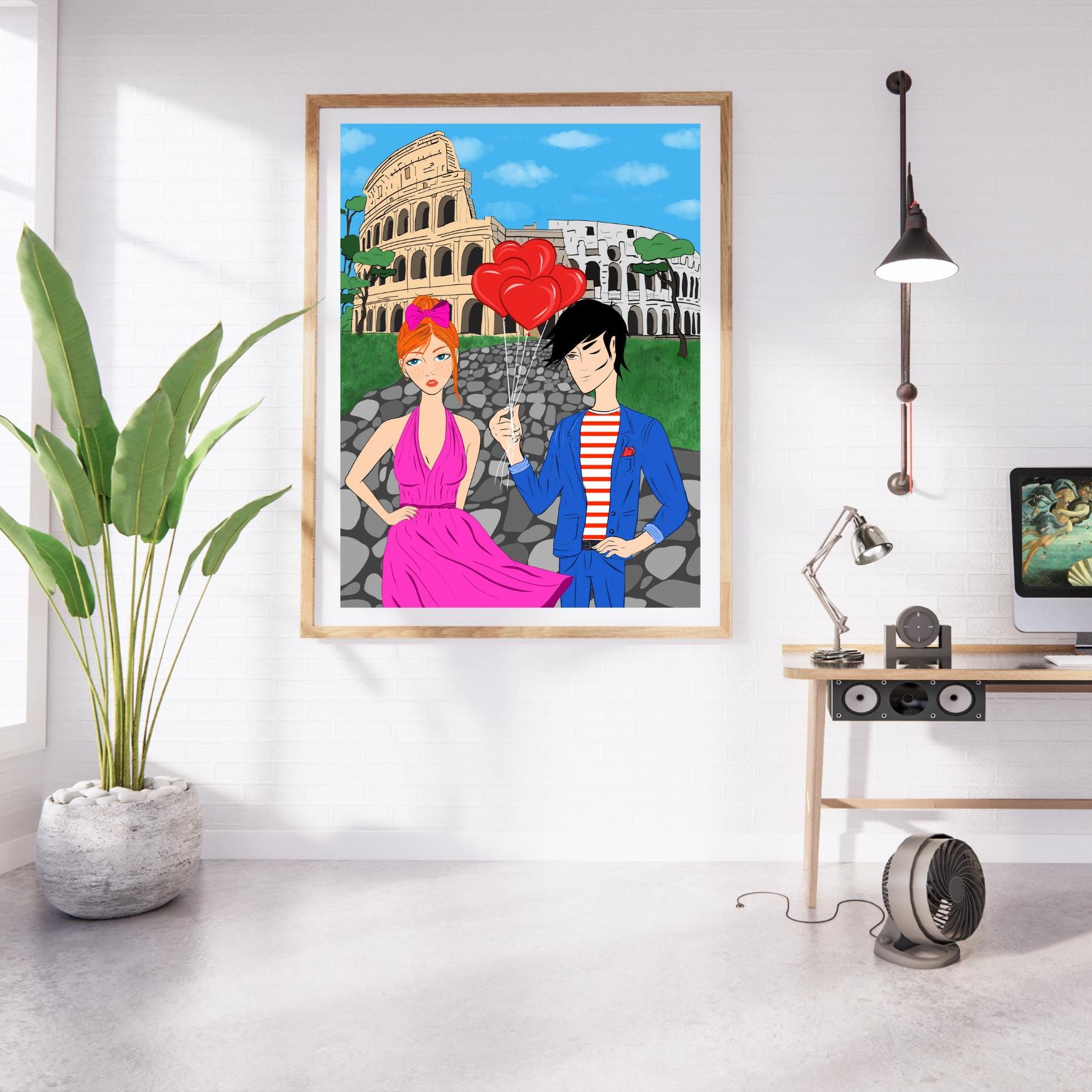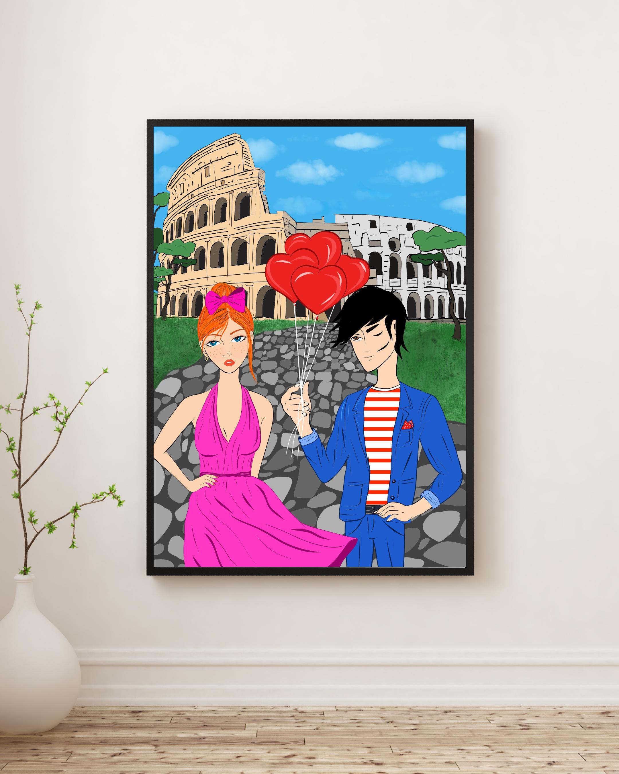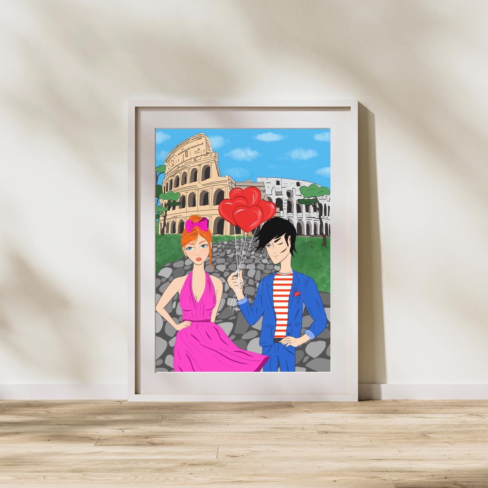 Romantic couple sharing heart balloons in front of the iconic Colosseum in Rome – a perfect Valentine's Day or anniversary gift! This hand-drawn (100% no AI) digital printable wall art captures love, adventure, and timeless romance.
