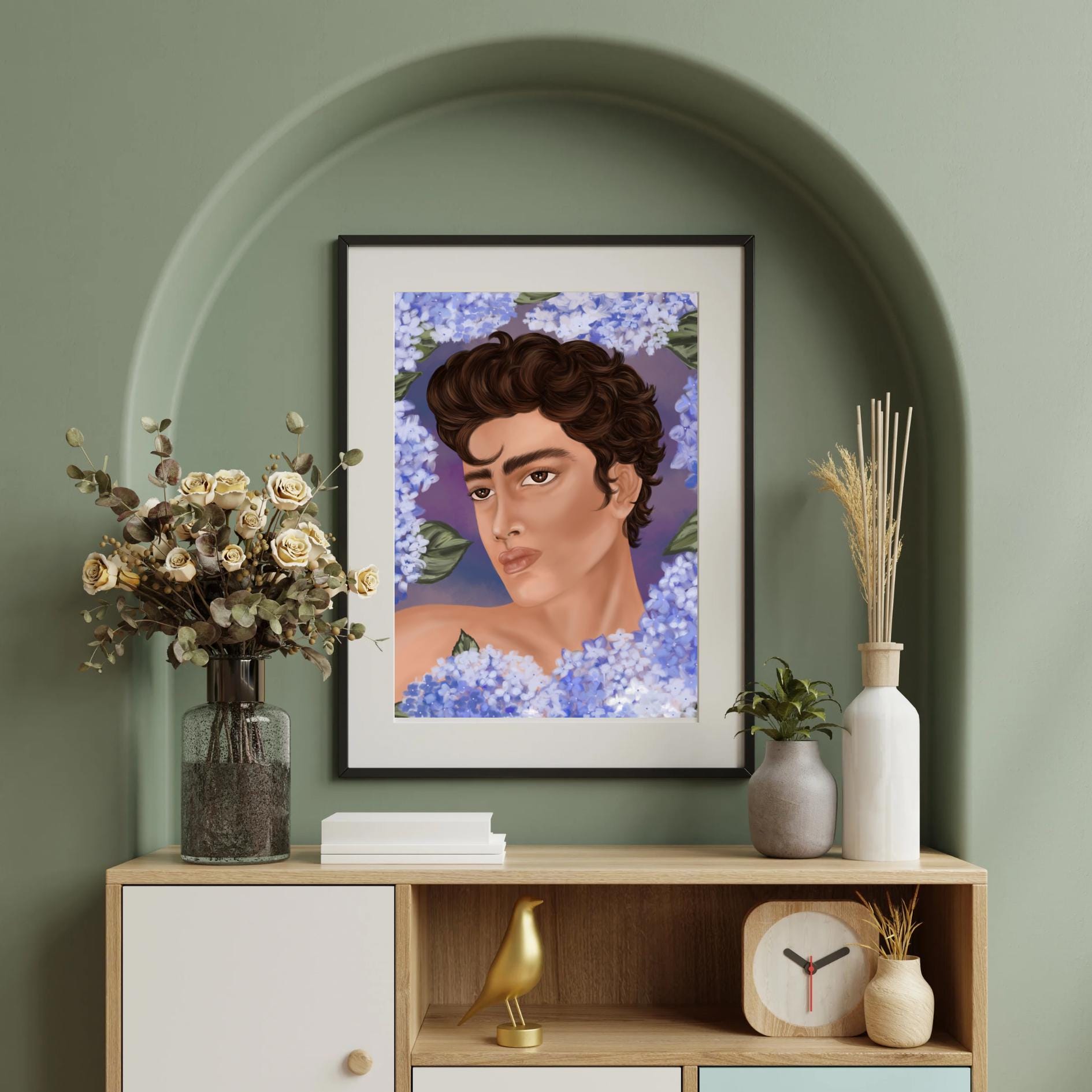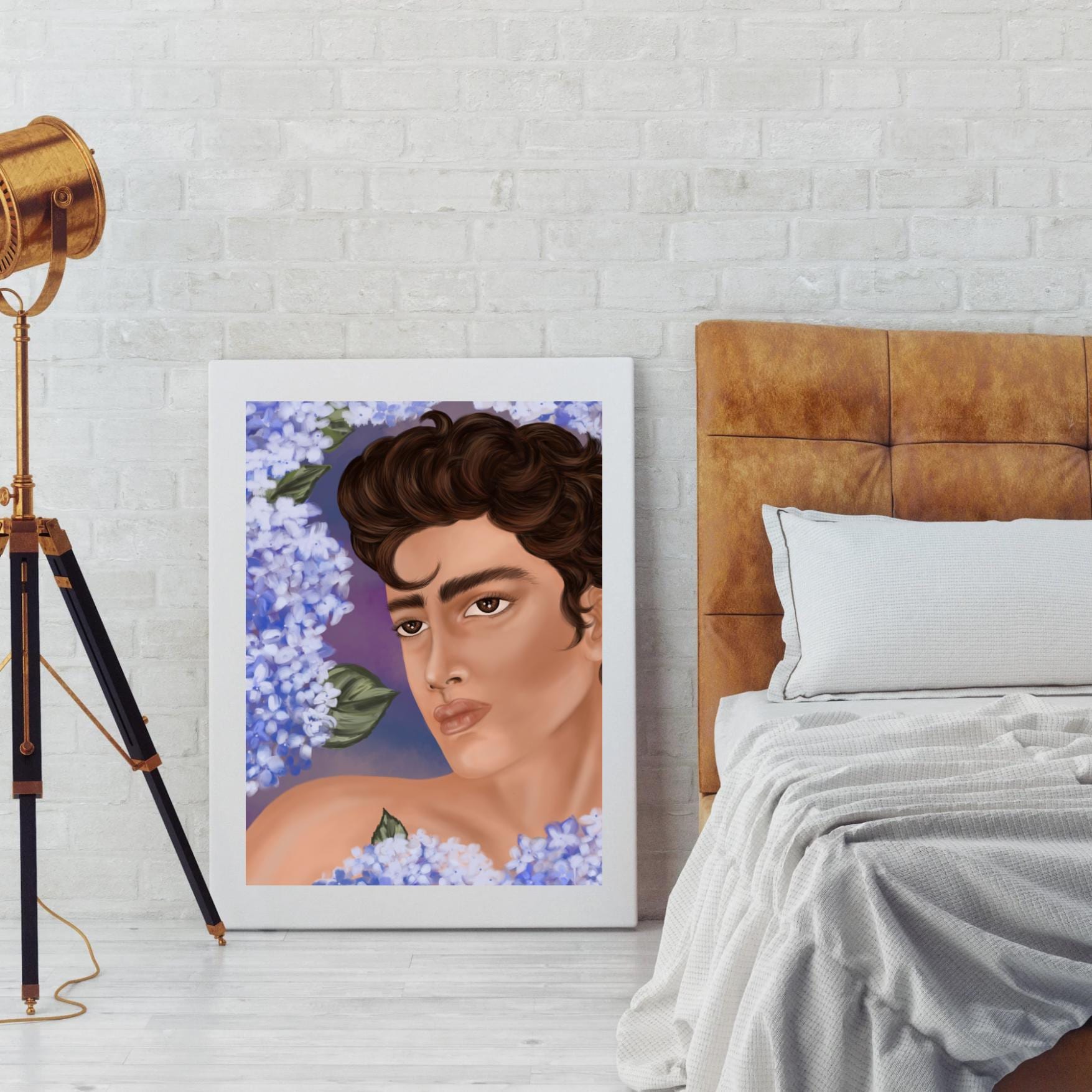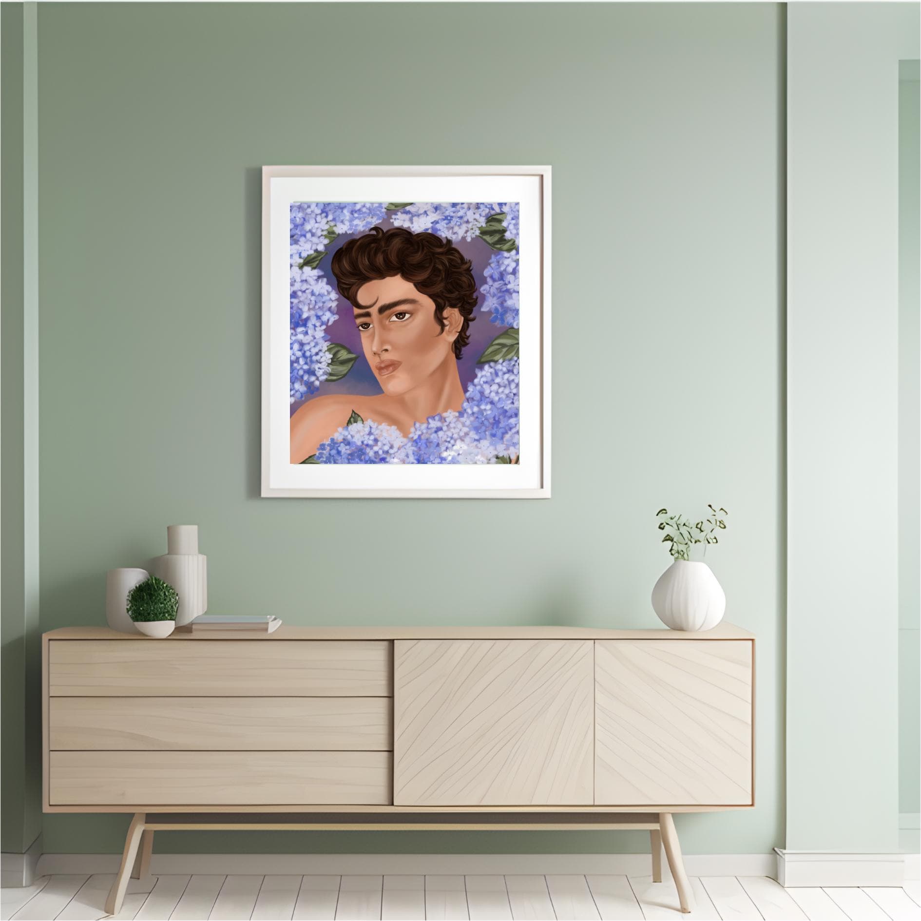 This modern male portrait blends masculine elegance with soft botanical elements. Surrounded by gentle blue florals, this hand-drawn digital artwork creates a calm yet powerful visual balance between strength and sensitivity.