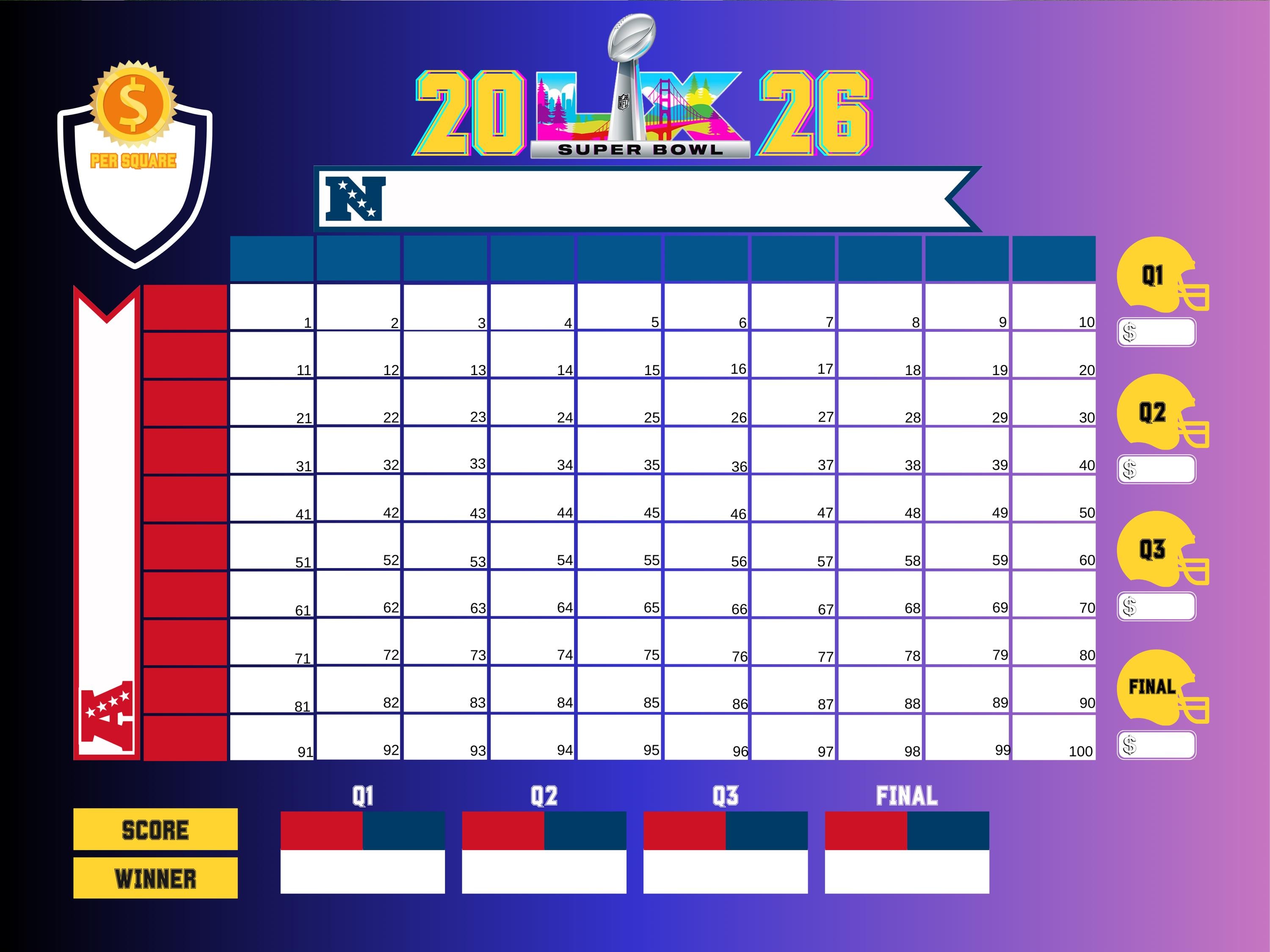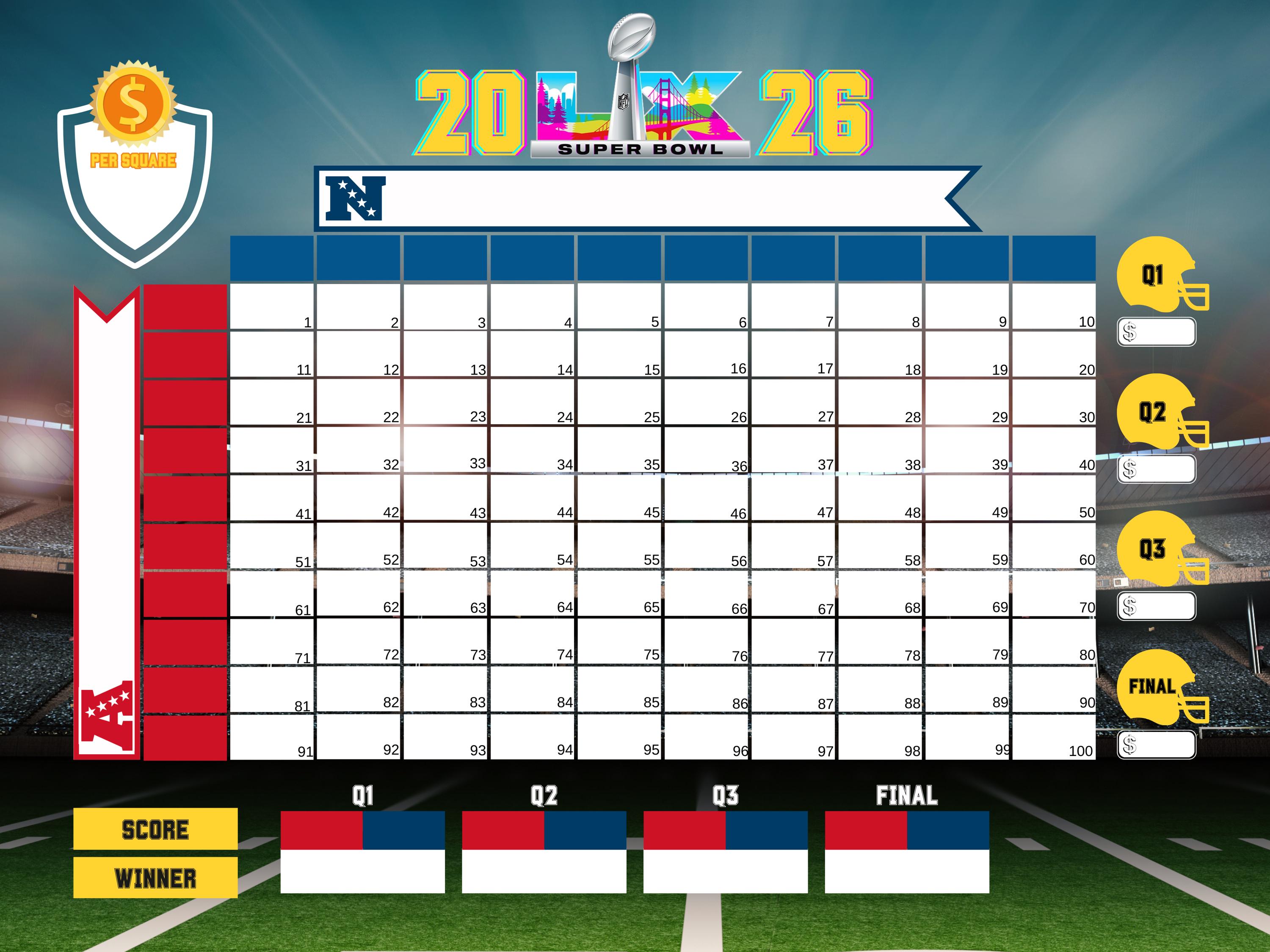 Whether you are hosting at home, running an office pool, or organizing a fundraiser, this football squares game adds structure, engagement, and entertainment to any big game event.