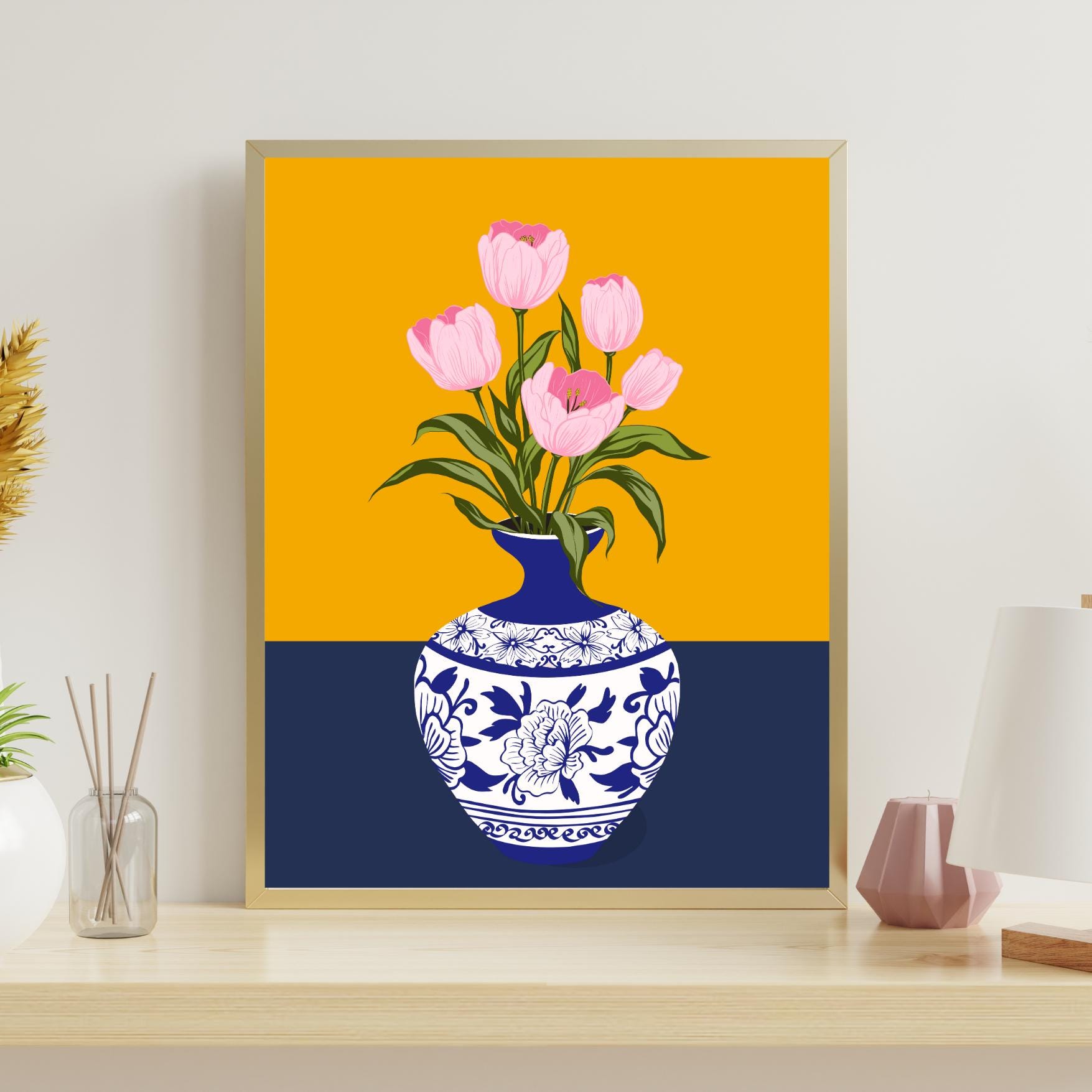 Bring a touch of timeless elegance to your home with this hand-drawn pink tulip bouquet in a classic blue porcelain vase printable wall art.