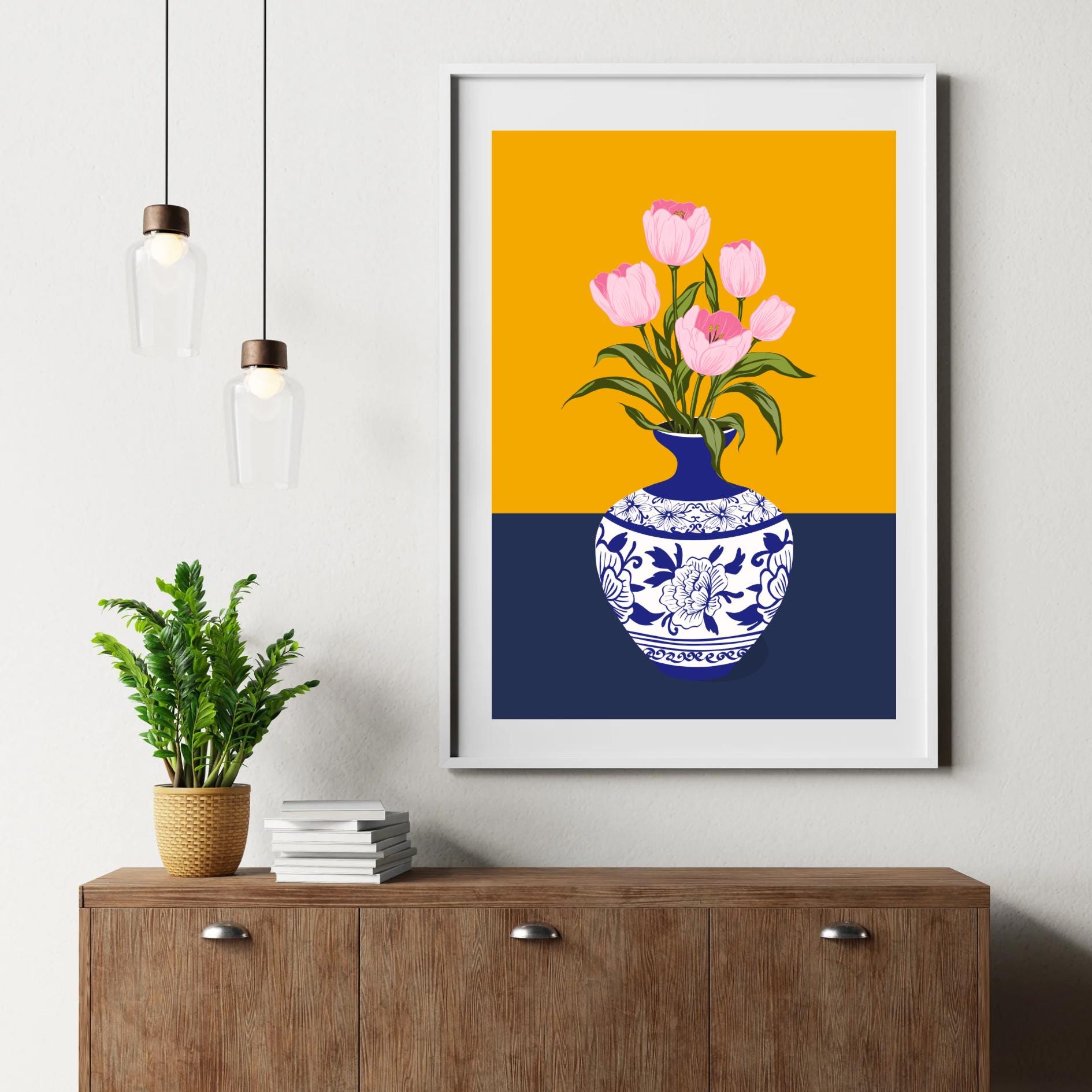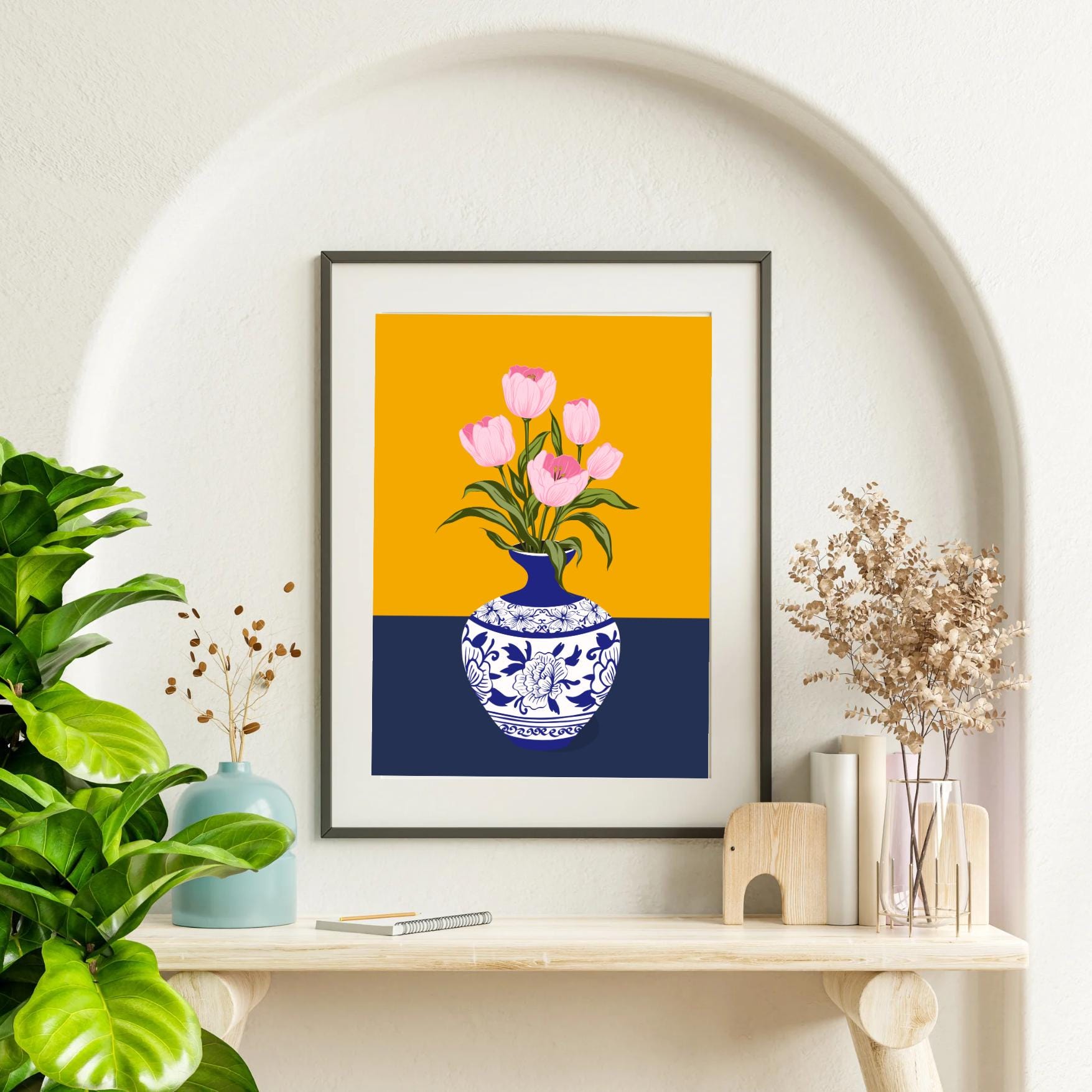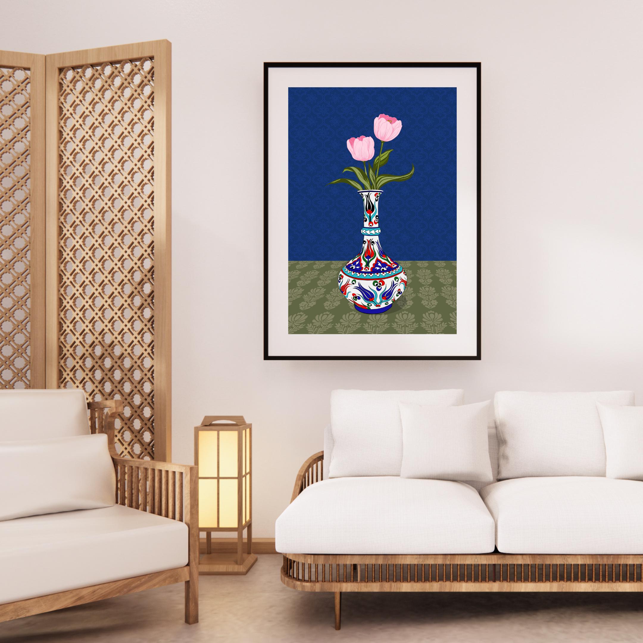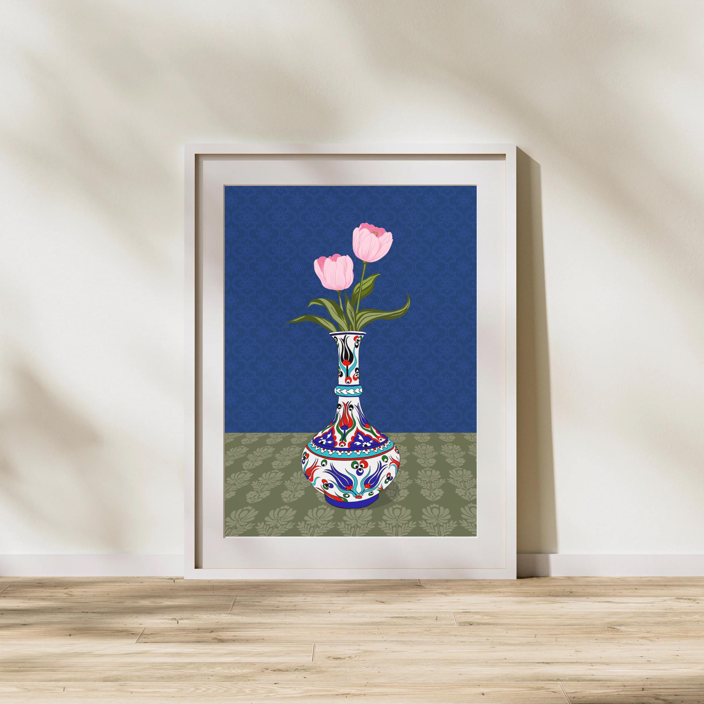 Instant gallery wall upgrade — this Set of 2 tulip vase prints brings Ottoman elegance and modern color contrast into your home. Featuring pink tulip bouquets in two unique vases: one inspired by Turkish Iznik / Ottoman tile motifs, and the other in a classic blue & white porcelain style vase.