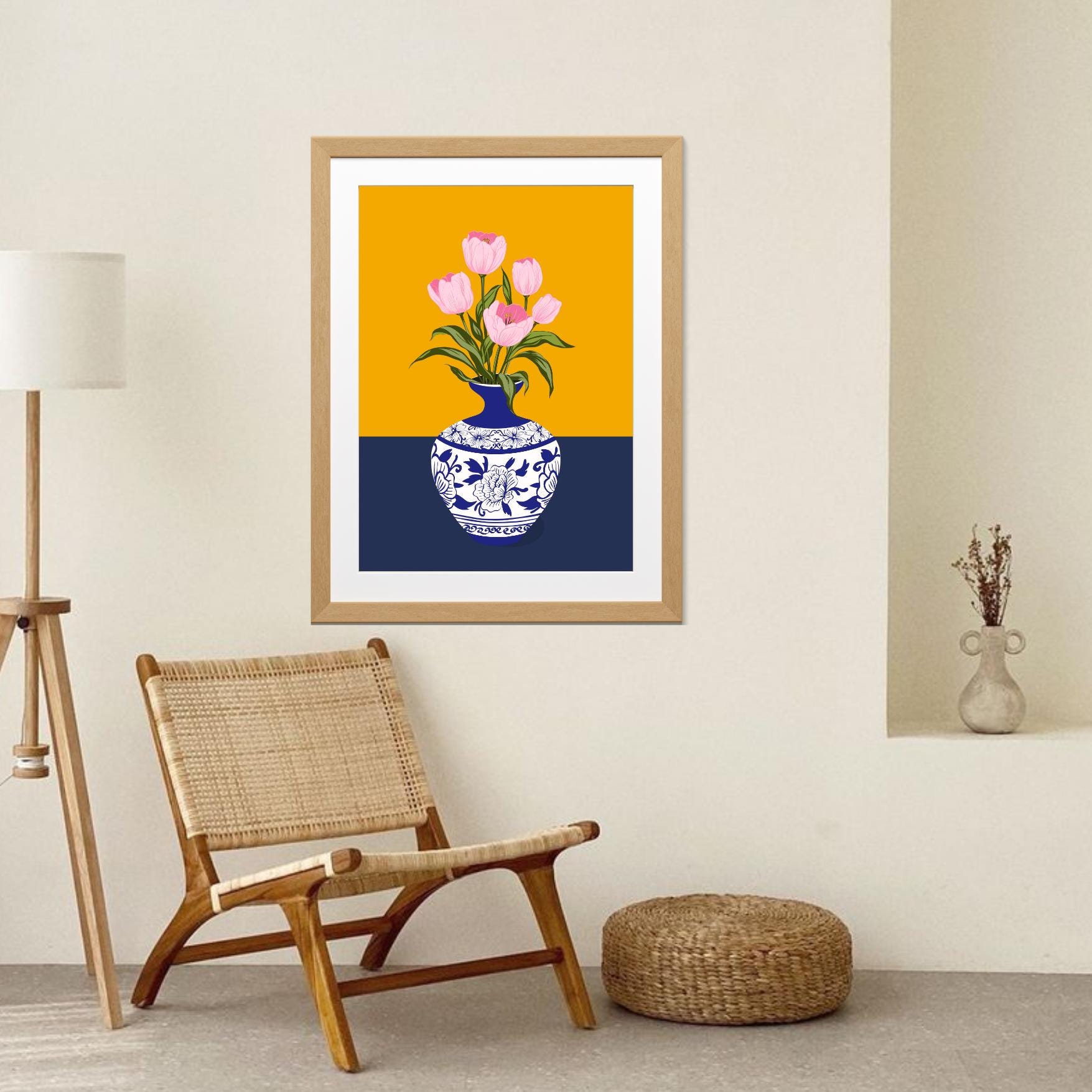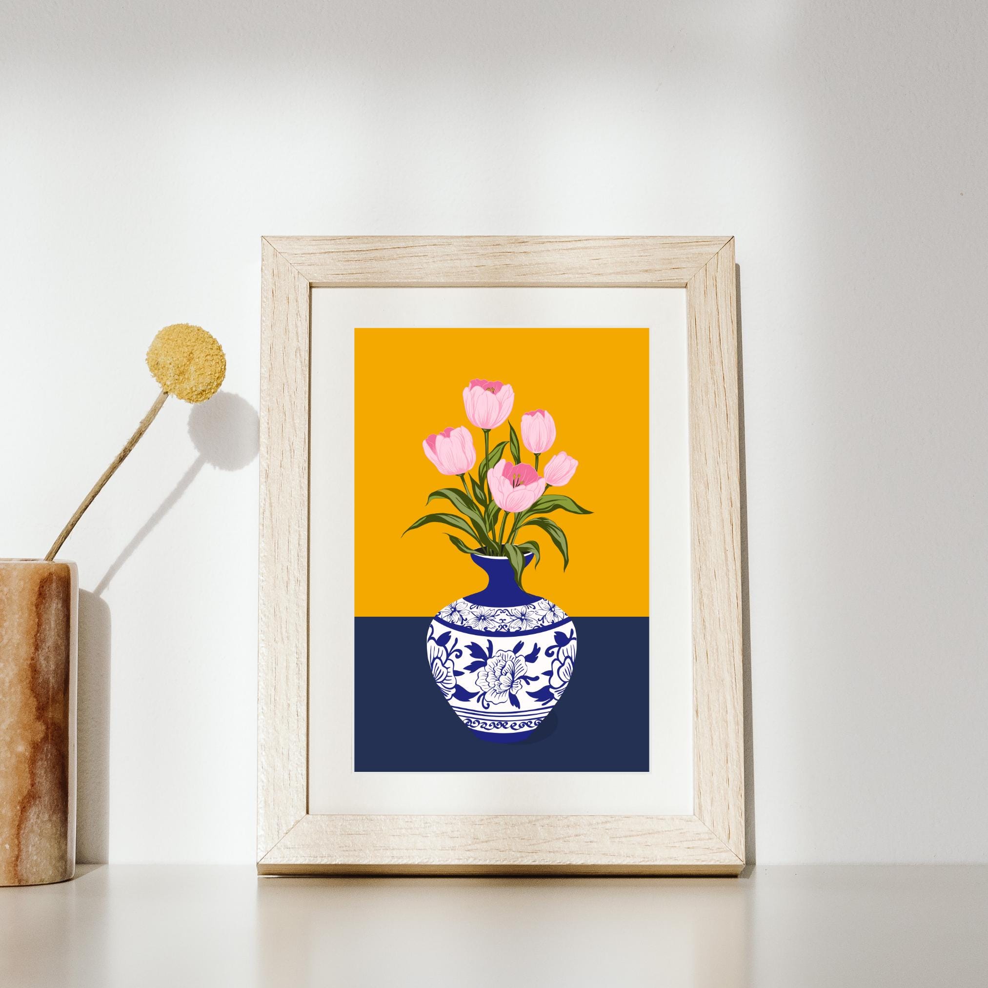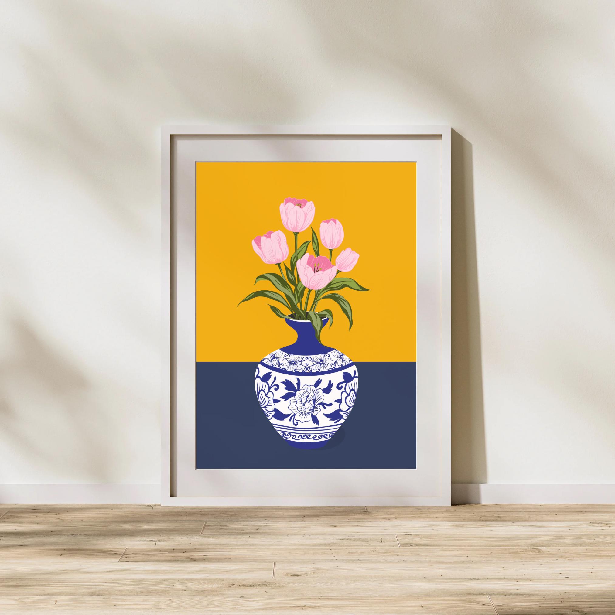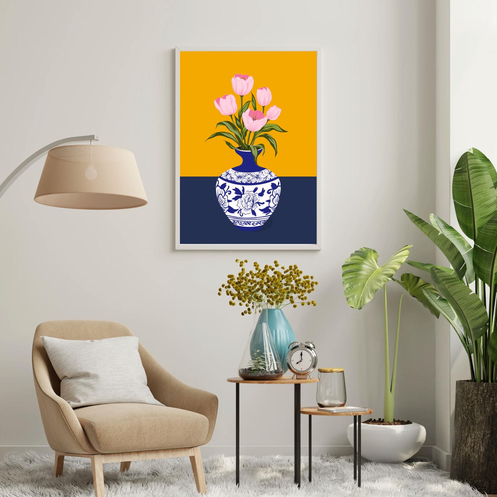 Instant gallery wall upgrade — this Set of 2 tulip vase prints brings Ottoman elegance and modern color contrast into your home. Featuring pink tulip bouquets in two unique vases: one inspired by Turkish Iznik / Ottoman tile motifs, and the other in a classic blue & white porcelain style vase.