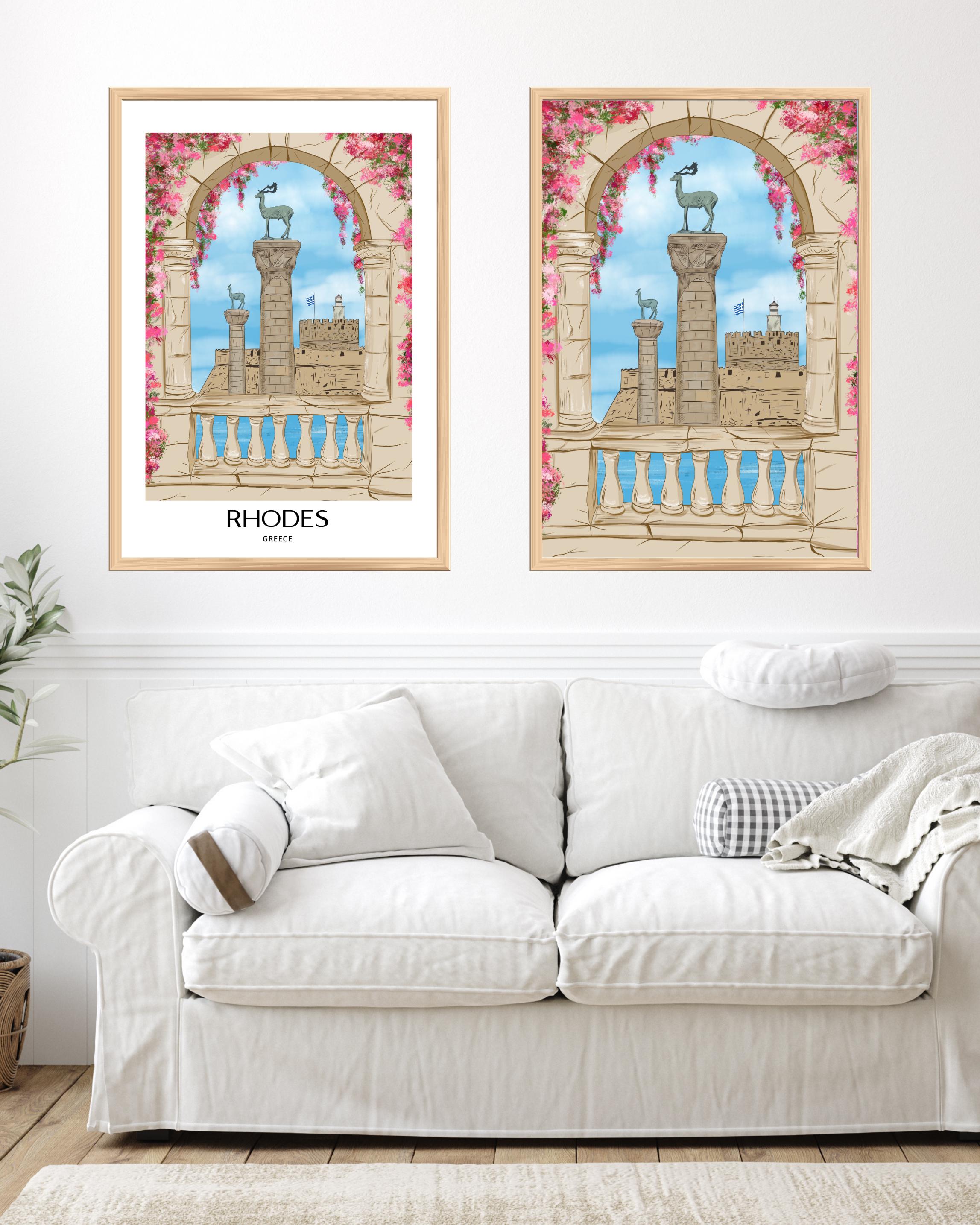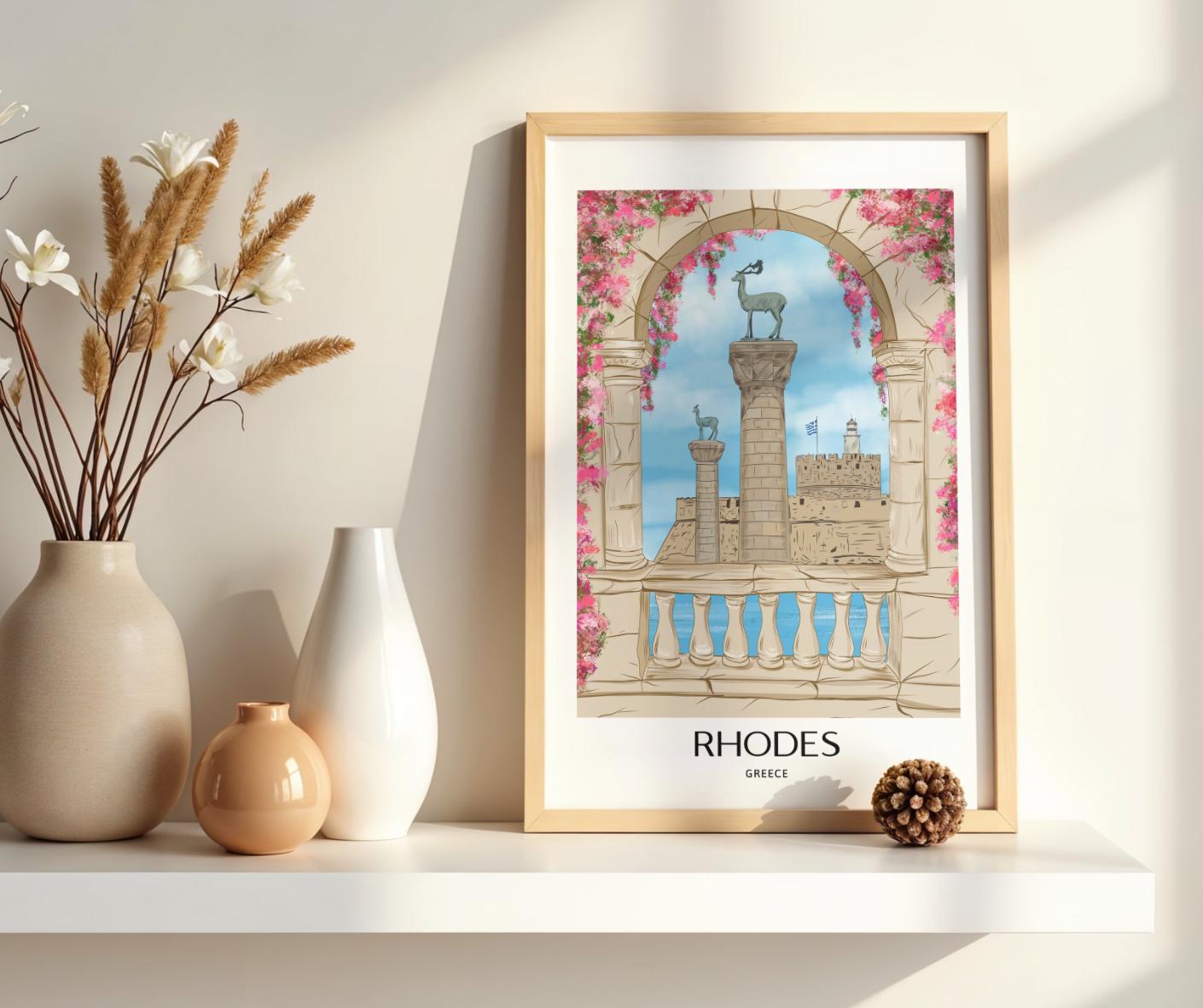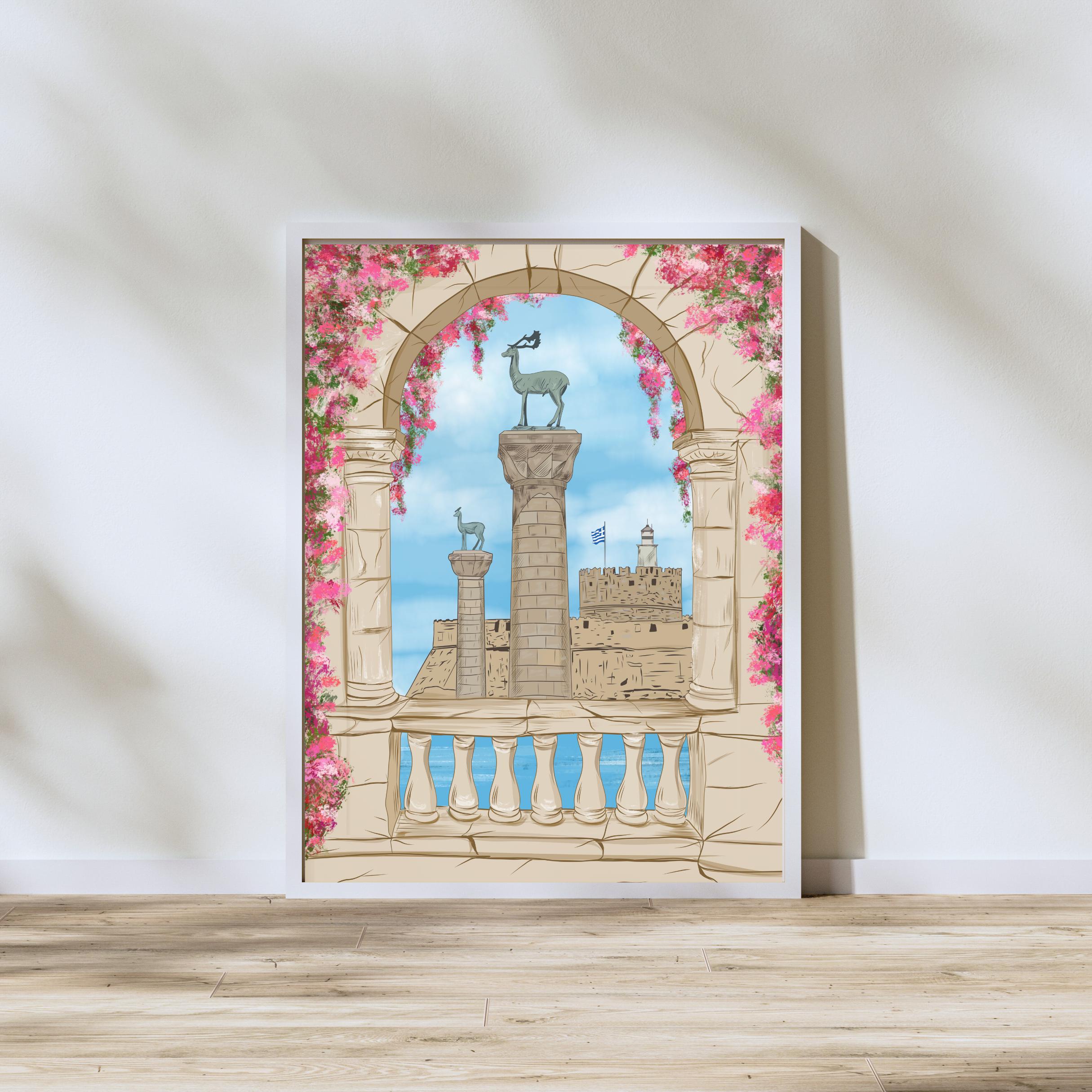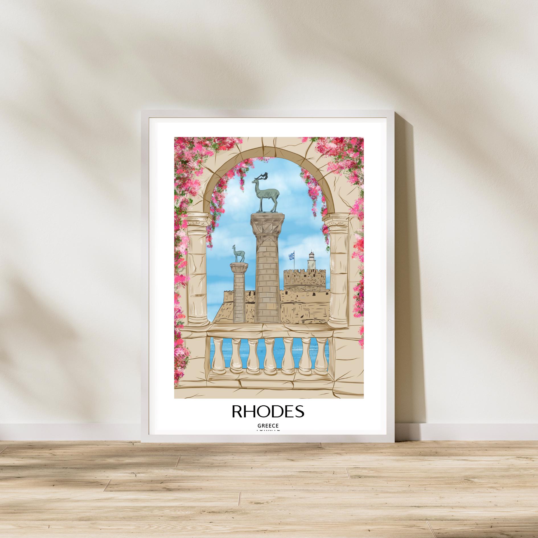 Experience the historic charm of the Dodecanese with this Hand Drawn Rhodes Greece Travel Poster. This original illustration captures the iconic Mandraki Harbour with its famous deer statues, the medieval fortress, and vibrant pink bougainvillea framing a perfect Mediterranean view.