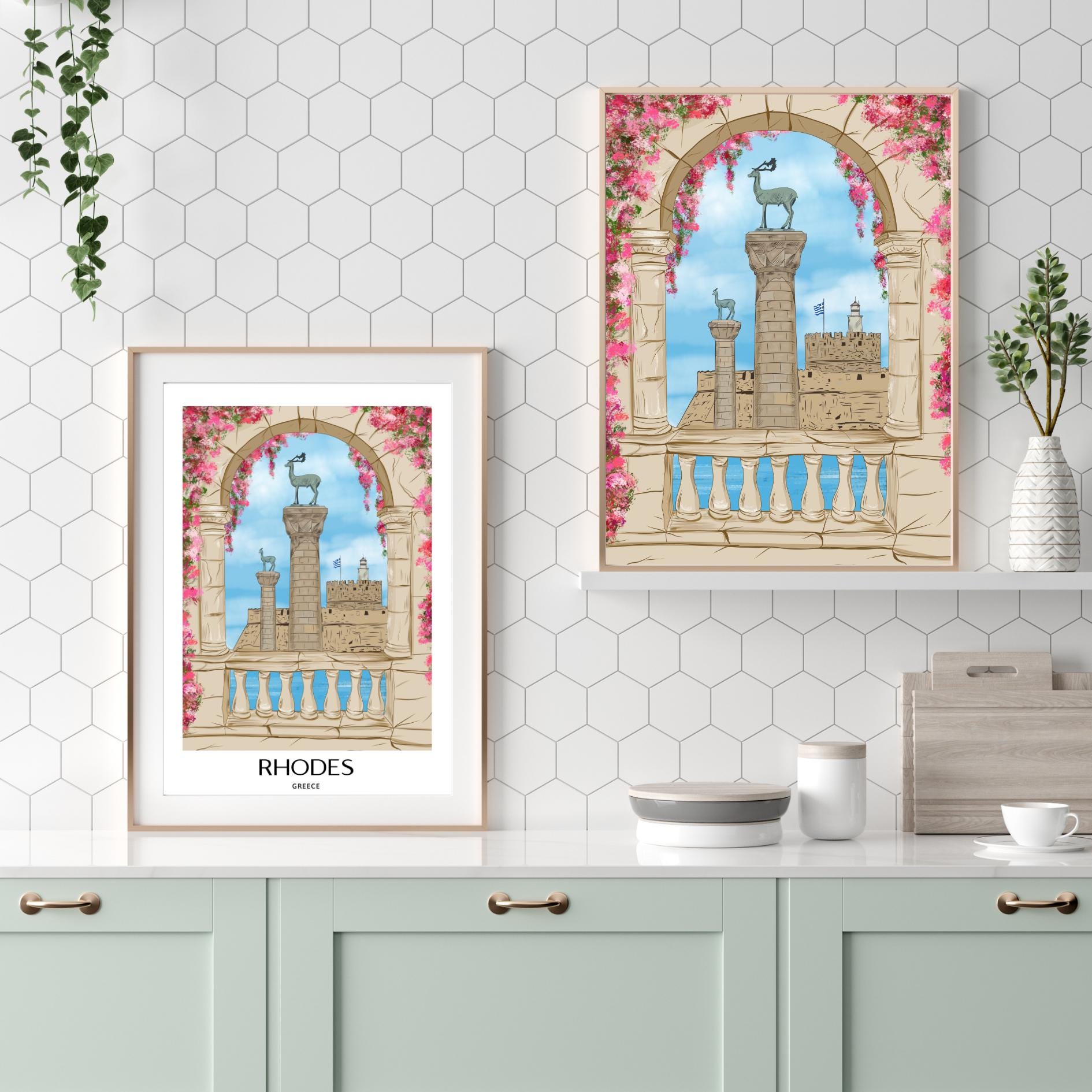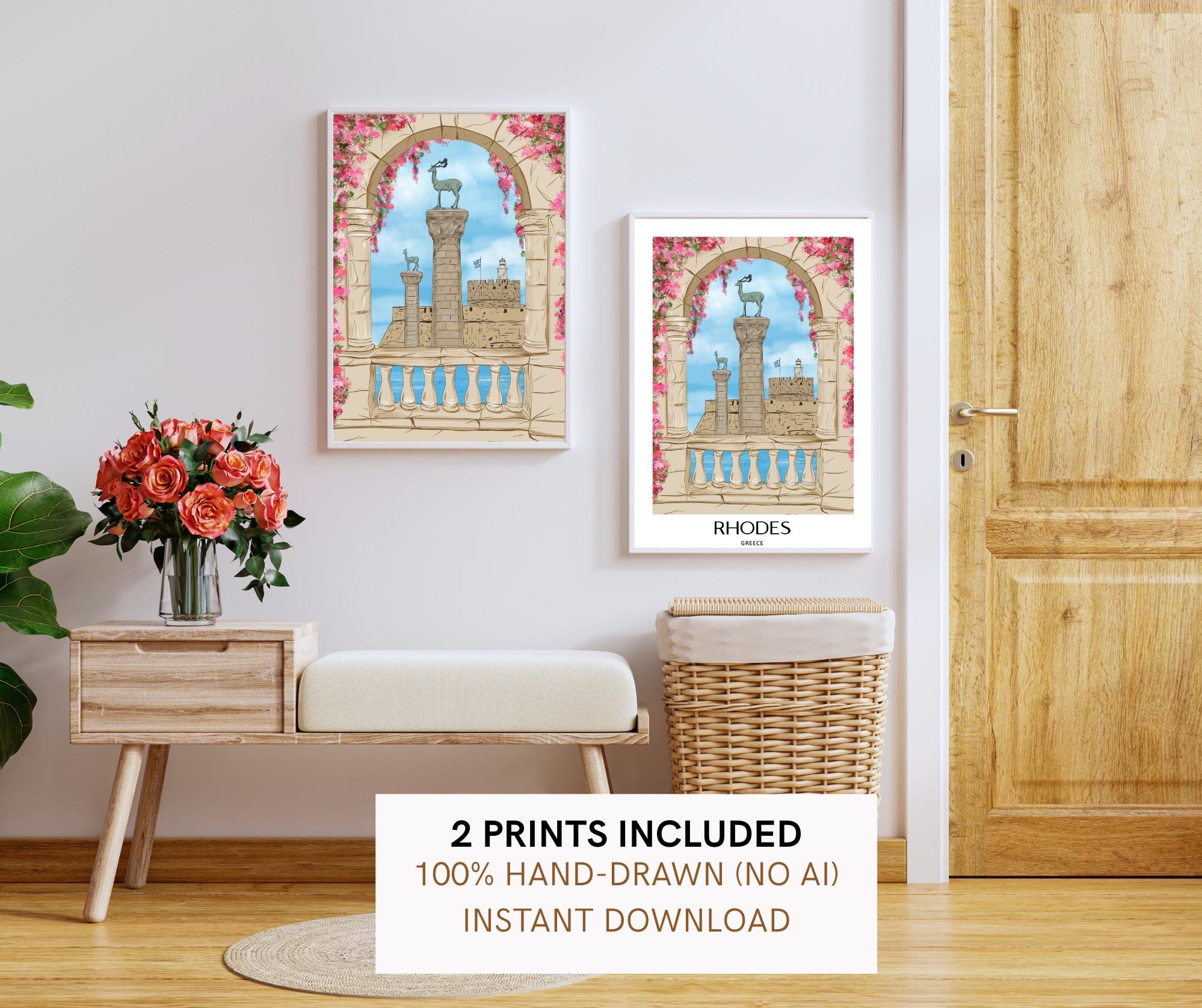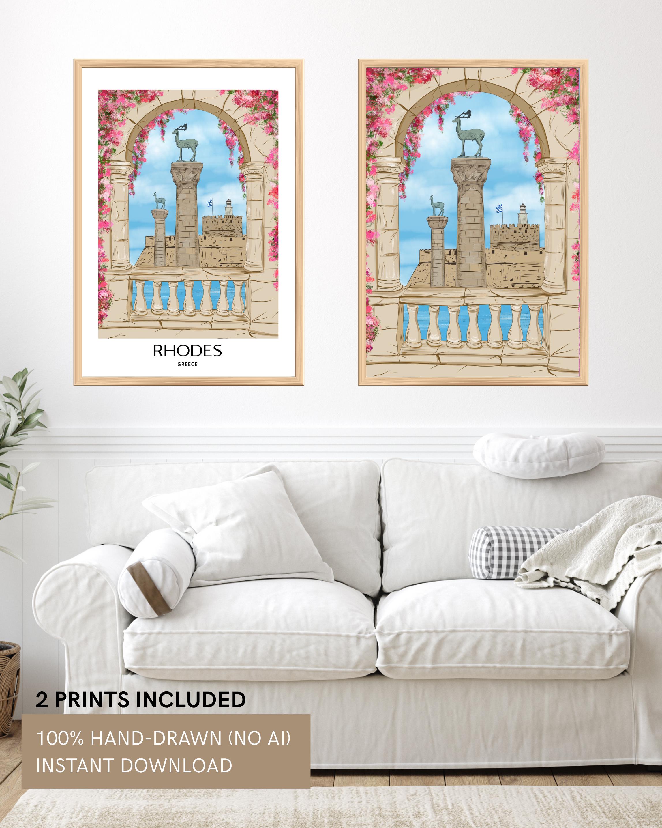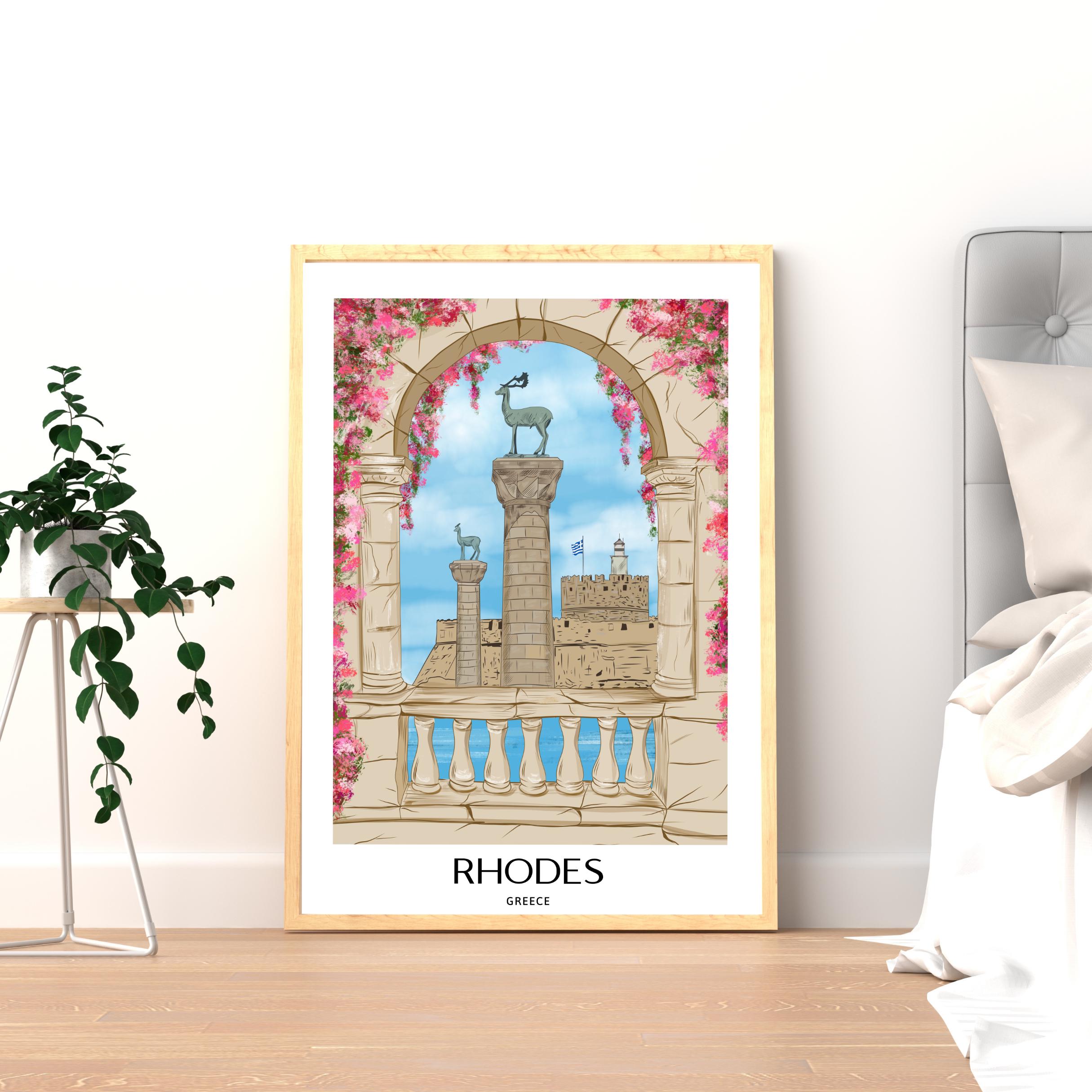 Experience the historic charm of the Dodecanese with this Hand Drawn Rhodes Greece Travel Poster. This original illustration captures the iconic Mandraki Harbour with its famous deer statues, the medieval fortress, and vibrant pink bougainvillea framing a perfect Mediterranean view.